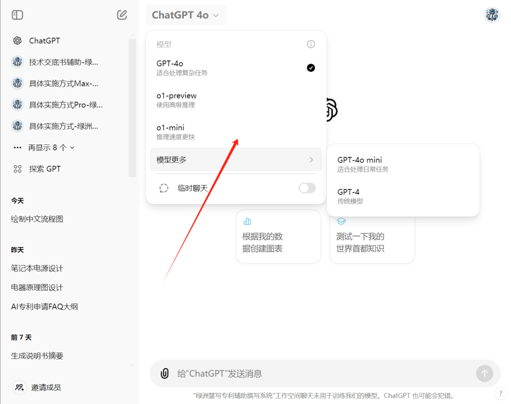 4. 模型的选择:非GPTs下,可以选择GPT-4o(主力模型),GPT-4omini(快速模型),GPT4(旧模型),01-preview(数学/物理/化学等高深知识理解模型),01-mini(编程模型)。