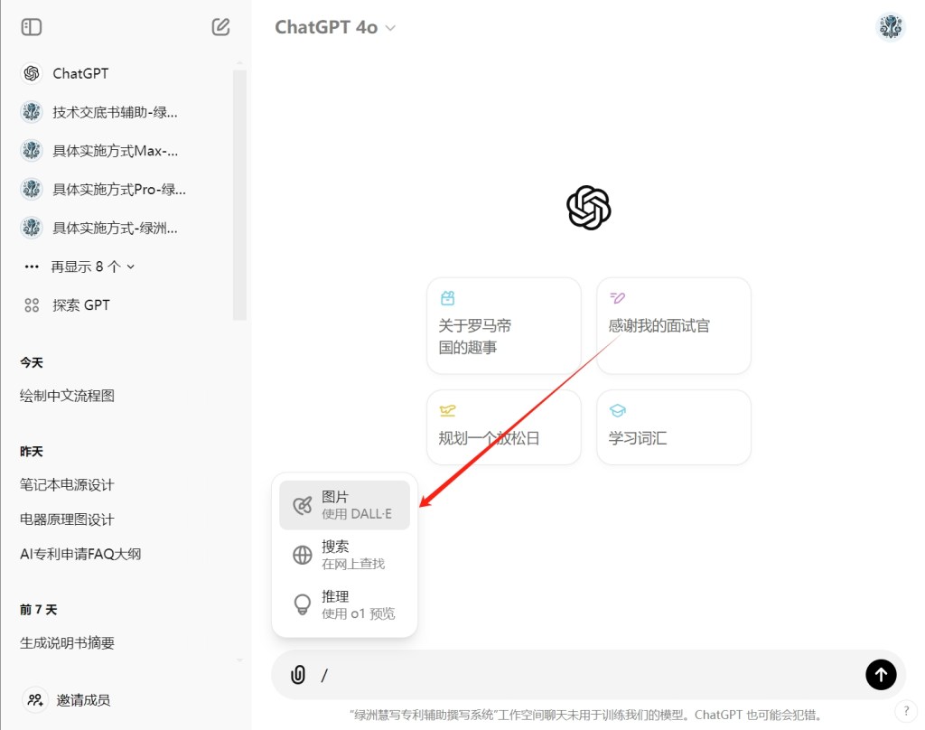 5. 功能的选择:非GPTs下,在一个新的对话开始时,可以通过使用“/”调取“图片,搜索,推理”模式选择,然后用键盘的上下键选取需要的功能。(如果没有反应就刷新网页)