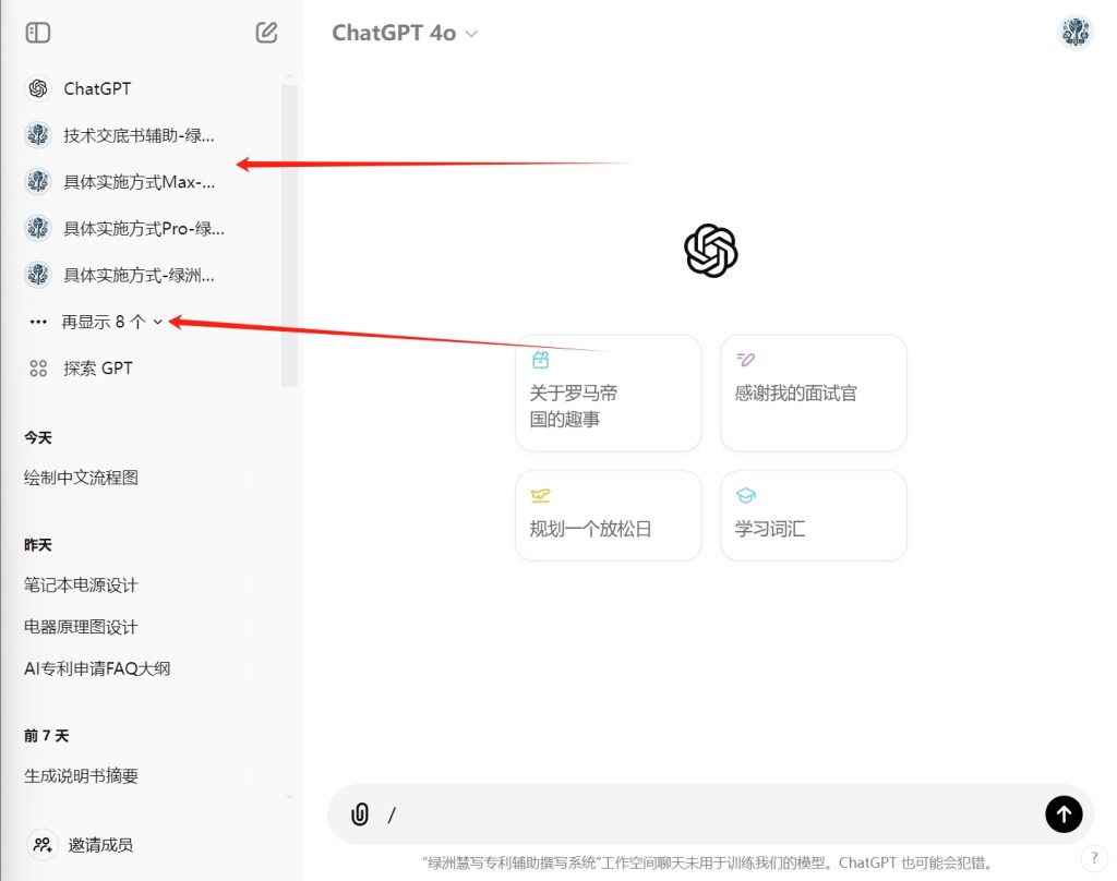 1. 访问绿洲慧写功能模块- 登录到你的 ChatGPT 账户,并在主界面左边栏可以找到绿洲慧写功能模块。由于模块较多,需要点击⬇显示全部的可用模块。